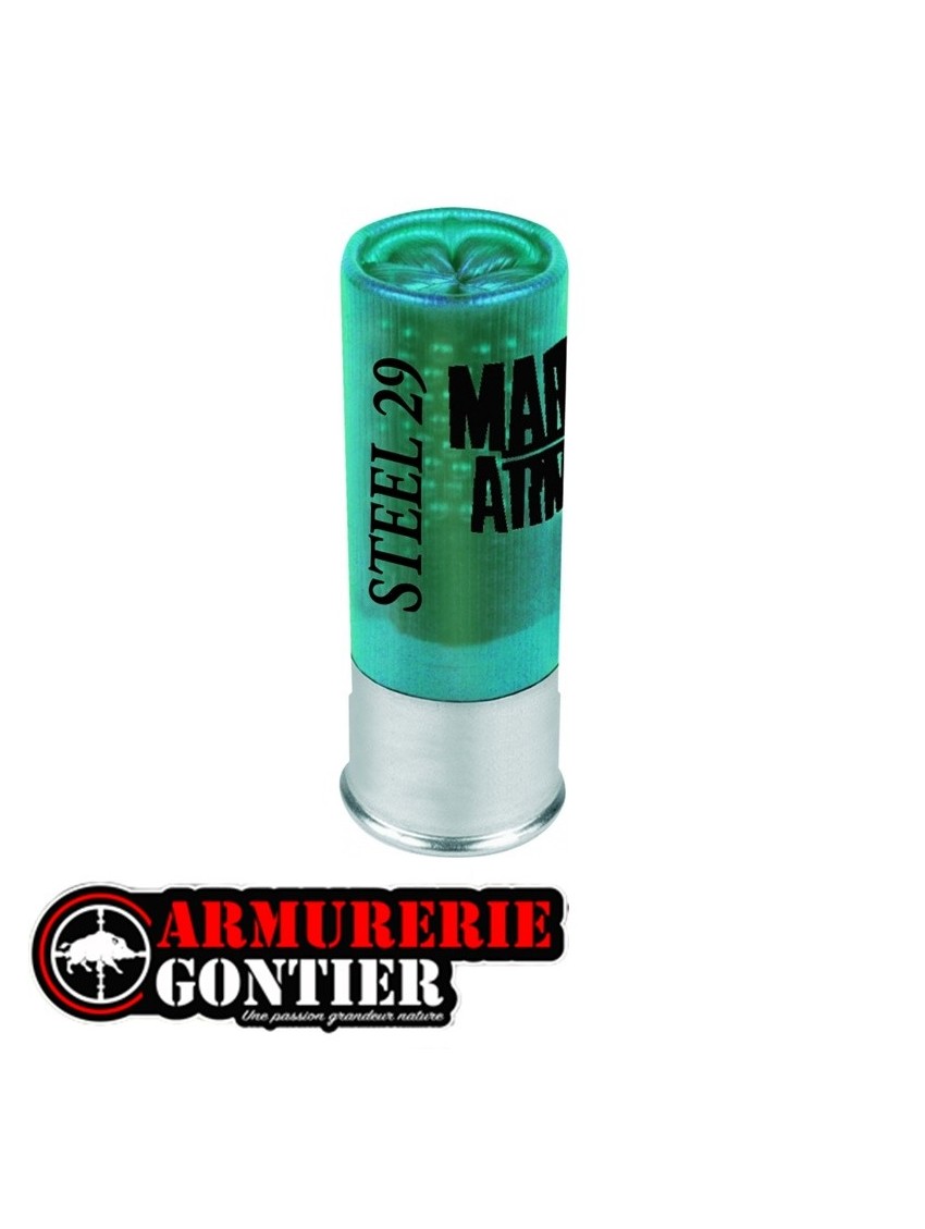 Chargée avec 29 grs de billes d'acier nickelé contenues dans une bourre "spéciale acier" qui protège les canons. cette cartouche doit être tirée dans des armes chambrées 70 mm dont l'épreuve est égale ou supérieure à 930 bar. elle peut être utilisée dans tous les chokes Portée maximale conseillée : 37m.Calibre : 12/70