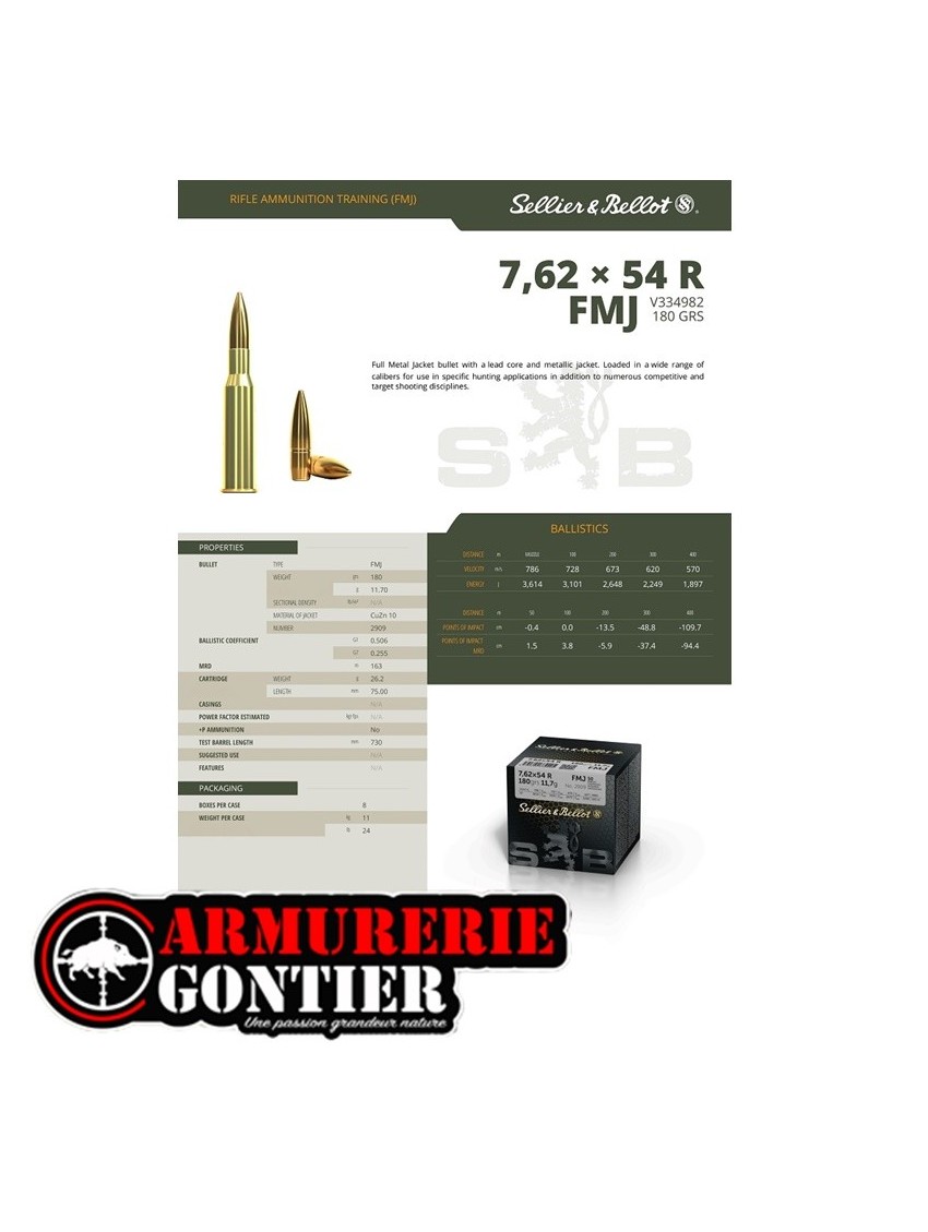 Les munitions Sellier & Bellot 7.62x54R FMJ 11.7g / 180gr sont spécialement conçues pour le tir sportif et l’entraînement, offrant une grande précision et une performance fiable.