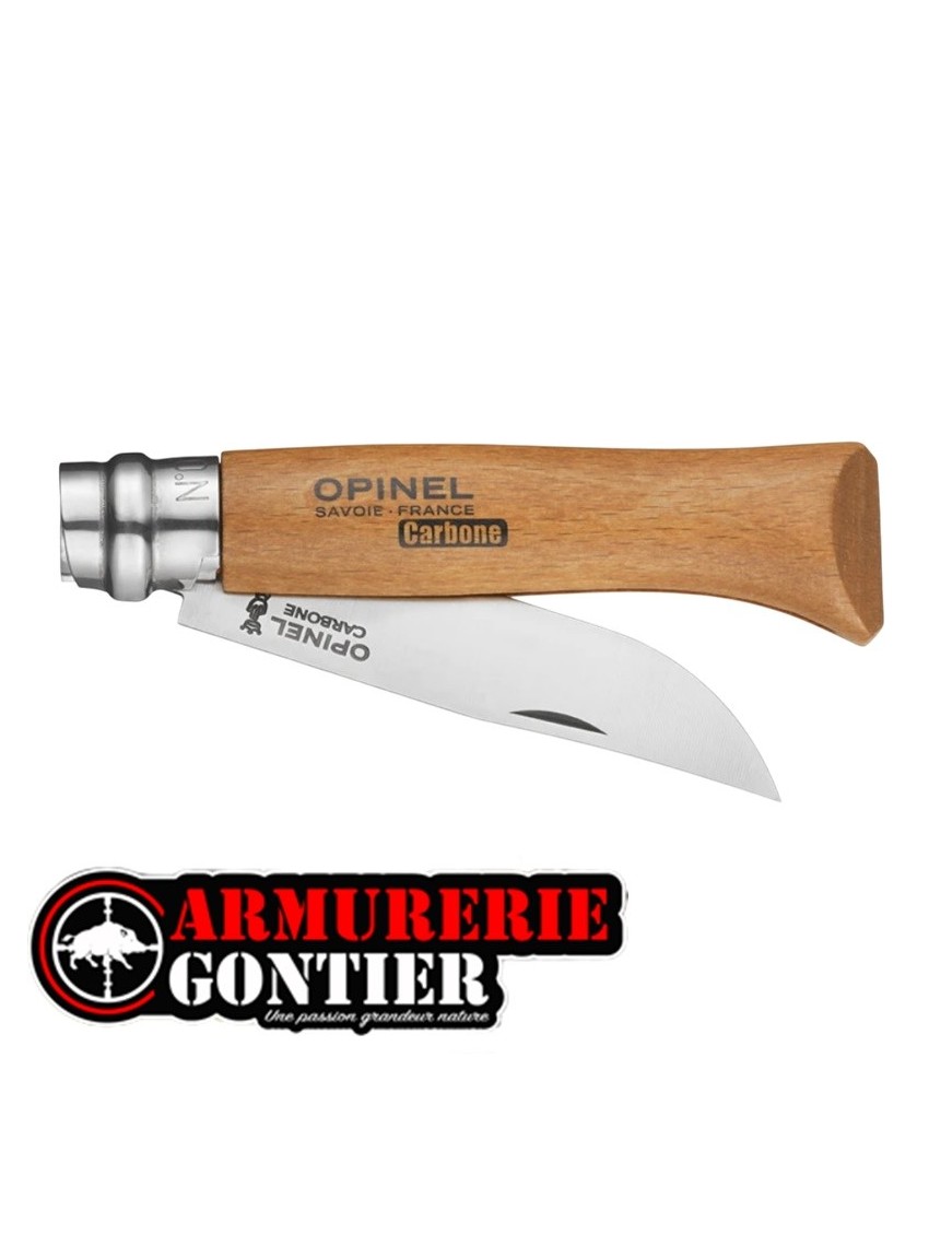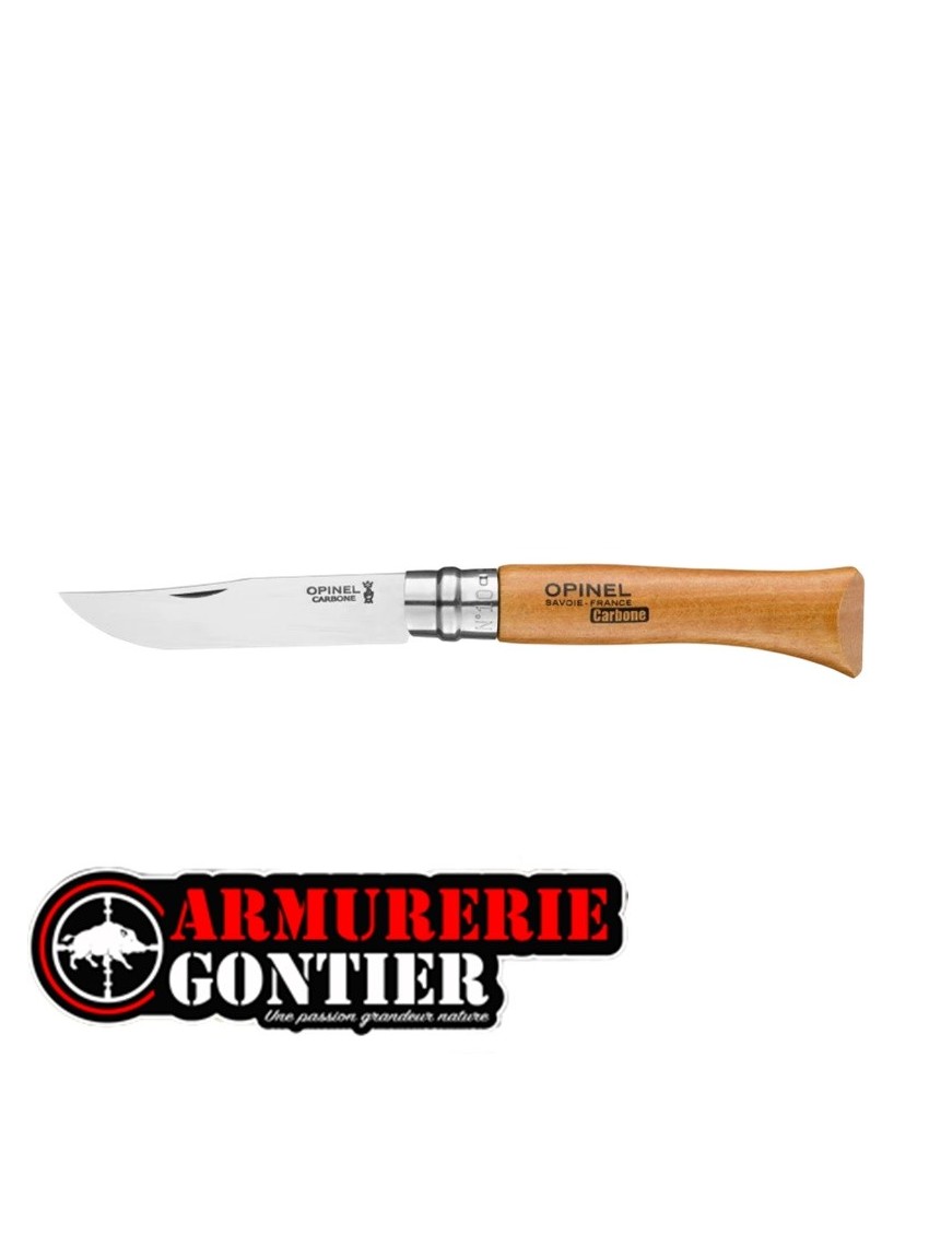 L'acier au carbone Opinel est un acier non allié, à haute teneur en carbone permettant d'obtenir après l'opération de traitement thermique l'excellente dureté qui garantit une parfaite tenue du tranchant ainsi qu'une grande résistance à l'usure et un réaffûtage facile. Cependant l'acier au carbone ayant une faible résistance à la corrosion par l'humidité, il nécessite des précautions d'utilisation : ne laissez pas votre couteau en milieu humide notamment en lave-vaisselle, essuyez la lame avec un chiffon gras après usage et graissez la souvent ainsi que son articulation.