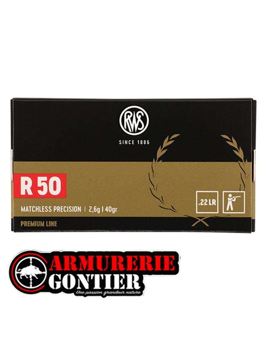 Munitions RWS .22 LR R50 2,6 g 40 grains LRN, vitesse 330 m/s, boîte de 50 cartouches. Munition de précision haut de gamme pour tir sportif et compétition.