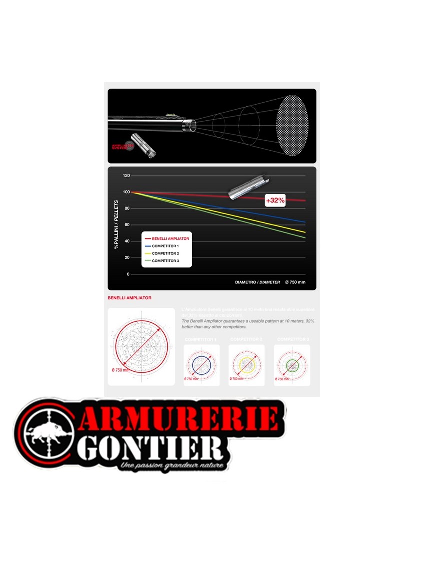 Doté d’un canon de 61 ou 65 cm, d’un choke interchangeable et du système exclusif Ampliator Benelli, il produit une gerbe plus dense, homogène et efficace, optimisée pour les tirs entre 10 et 20 mètres, offrant jusqu’à 32 % de performance supplémentaire.