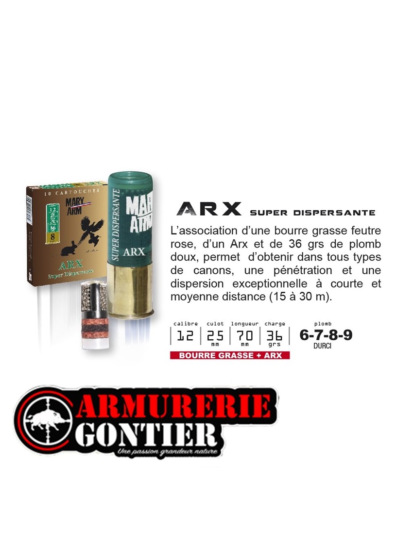 Les Mary Arm ARX Super Dispersante 12/70 36 g sont des cartouches idéales pour la chasse en milieu fermé, offrant une dispersion exceptionnelle et une efficacité redoutable entre 15 et 30 mètres.